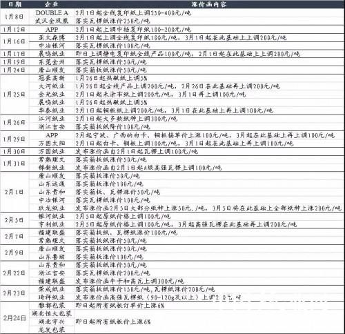 自2018年1月的第二周开始便陆续有部分基地落实瓦楞、箱板涨价,年后联盛、荣成、金凤凰等也纷纷加入了涨价队列。
